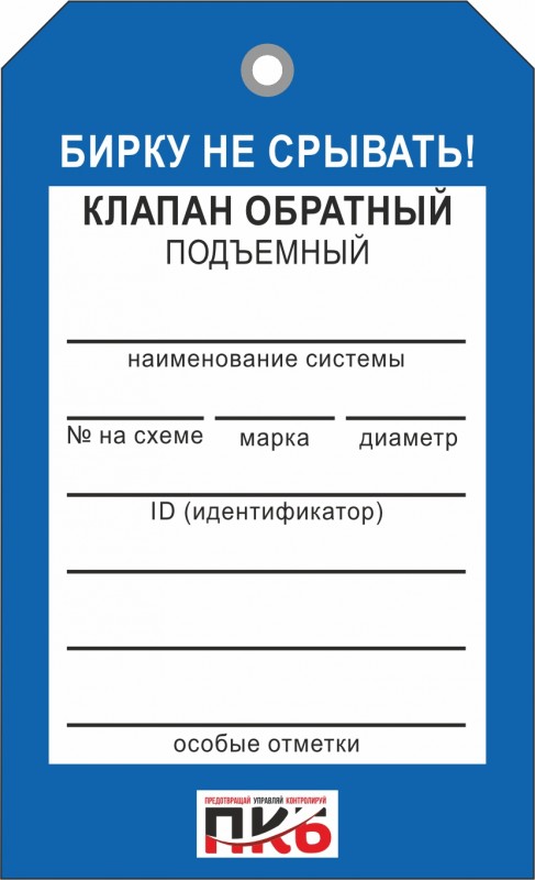 Информационная бирка "Клапан обратный подъемный". Изготовлена из пластика ПВХ, толщиной 0,3 мм, без ламинации, диаметр отверстия 7 мм. По желанию заказчика толщина бирки может быть увеличена до 1-2 мм. Нанесение текста необходимо производить маркером или шариковой ручкой. Размер 70 х 115 х 0,3 мм.
