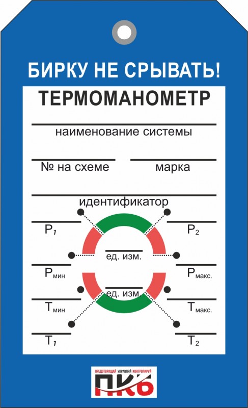 Информационная бирка "Термоманометр". Изготовлена из пластика ПВХ, толщиной 0,3 мм, без ламинации, диаметр отверстия 7 мм. По желанию заказчика толщина бирки может быть увеличена до 1-2 мм. Нанесение текста необходимо производить маркером или шариковой ручкой. Размер 70 х 115 х 0,3 мм.